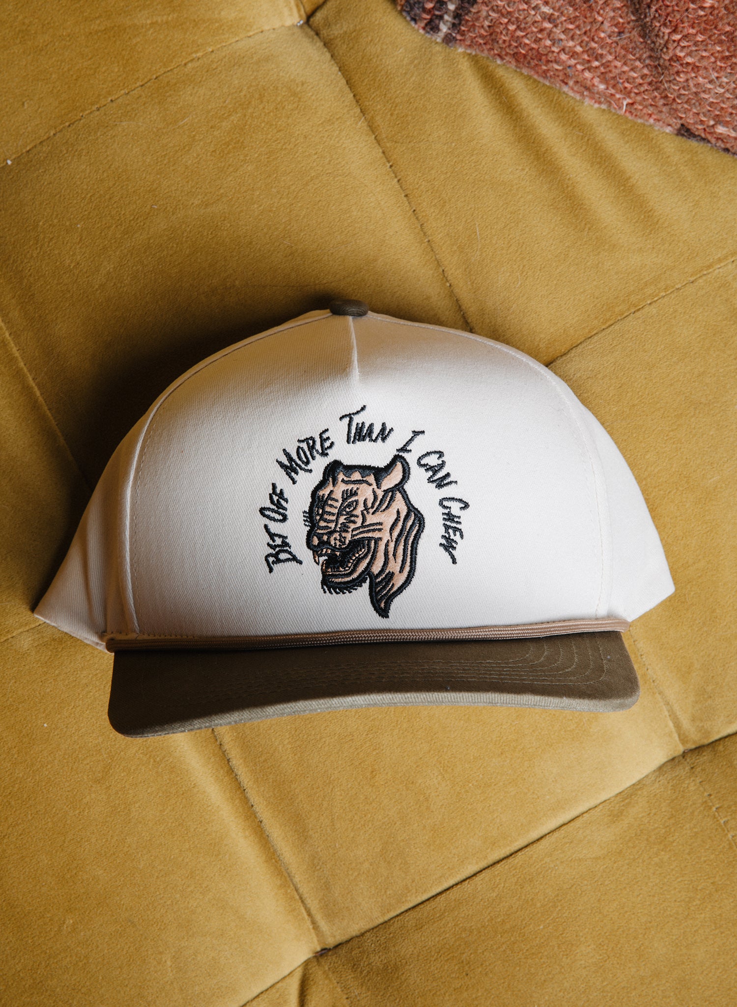 Front and center: an embroidered tattoo-style tiger, fierce and detailed, paired with the iconic phrase "Bit Off More Than I Can Chew" in bold lettering. It’s a badge of ambition, a wink at overcommitment, and an instant conversation starter.