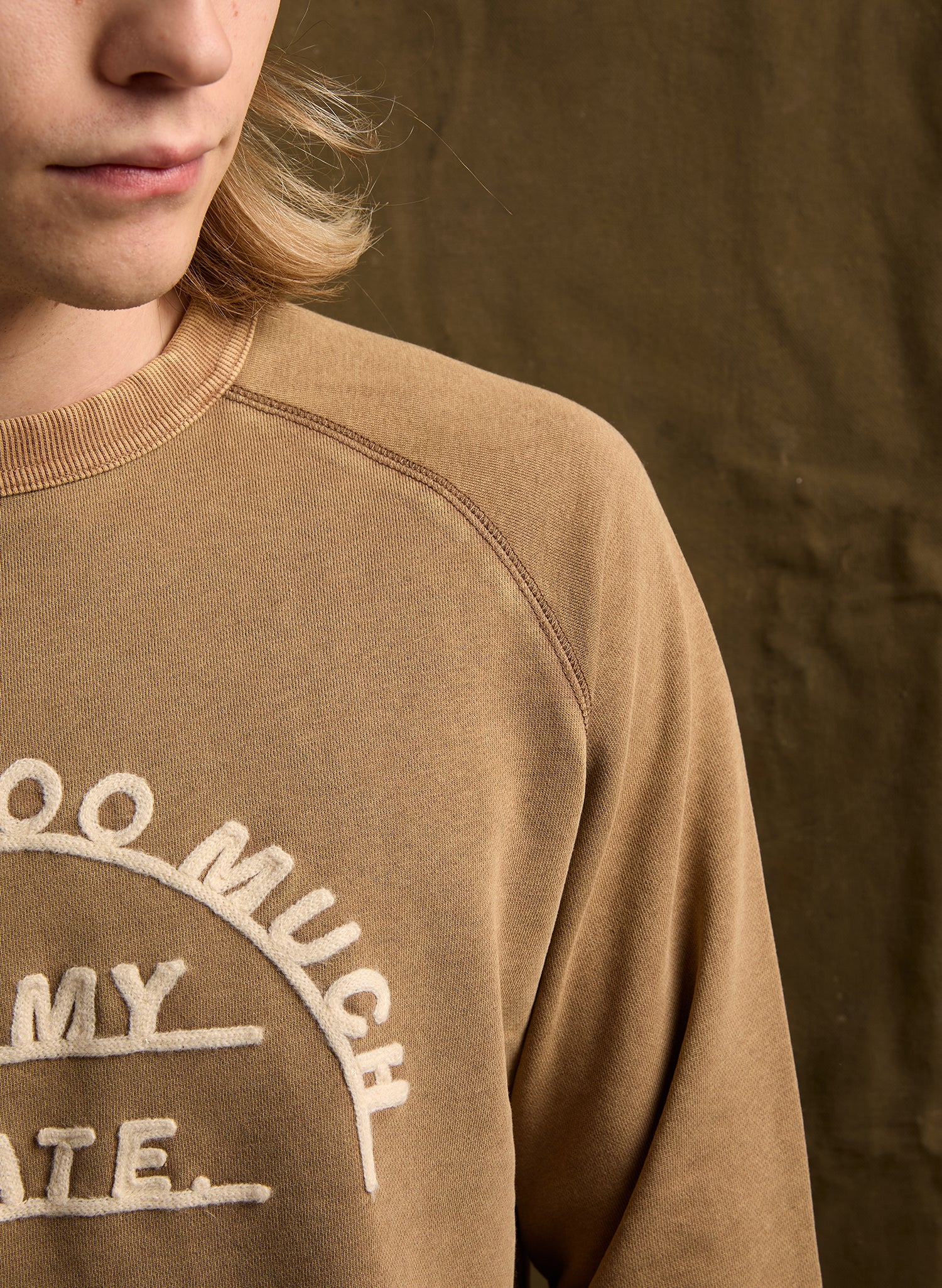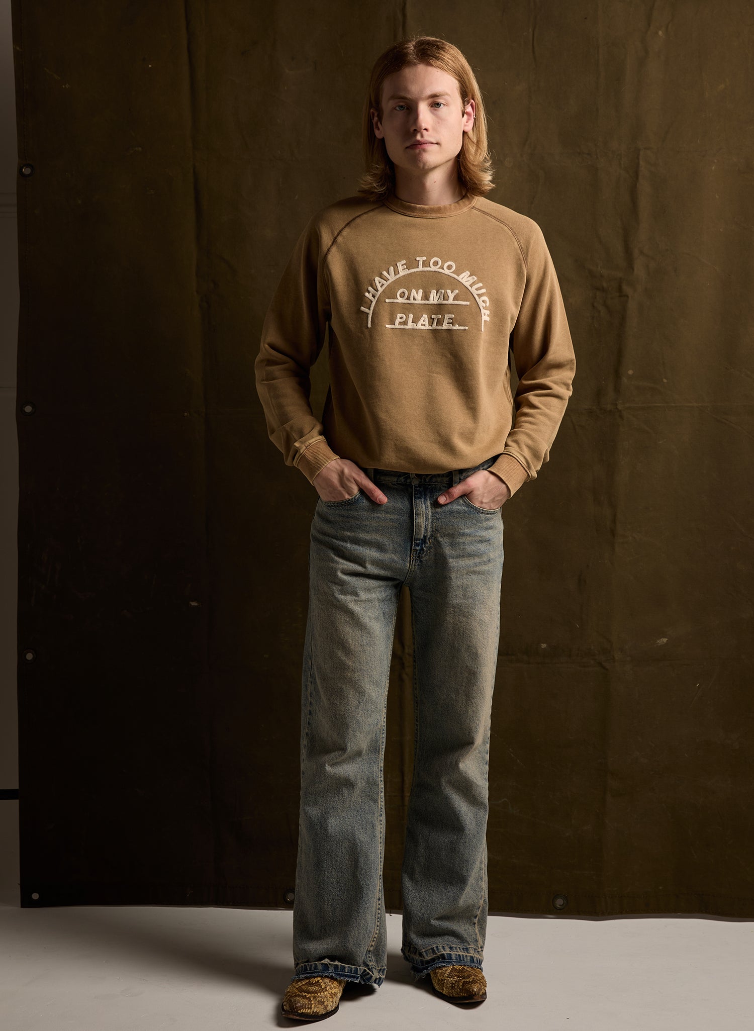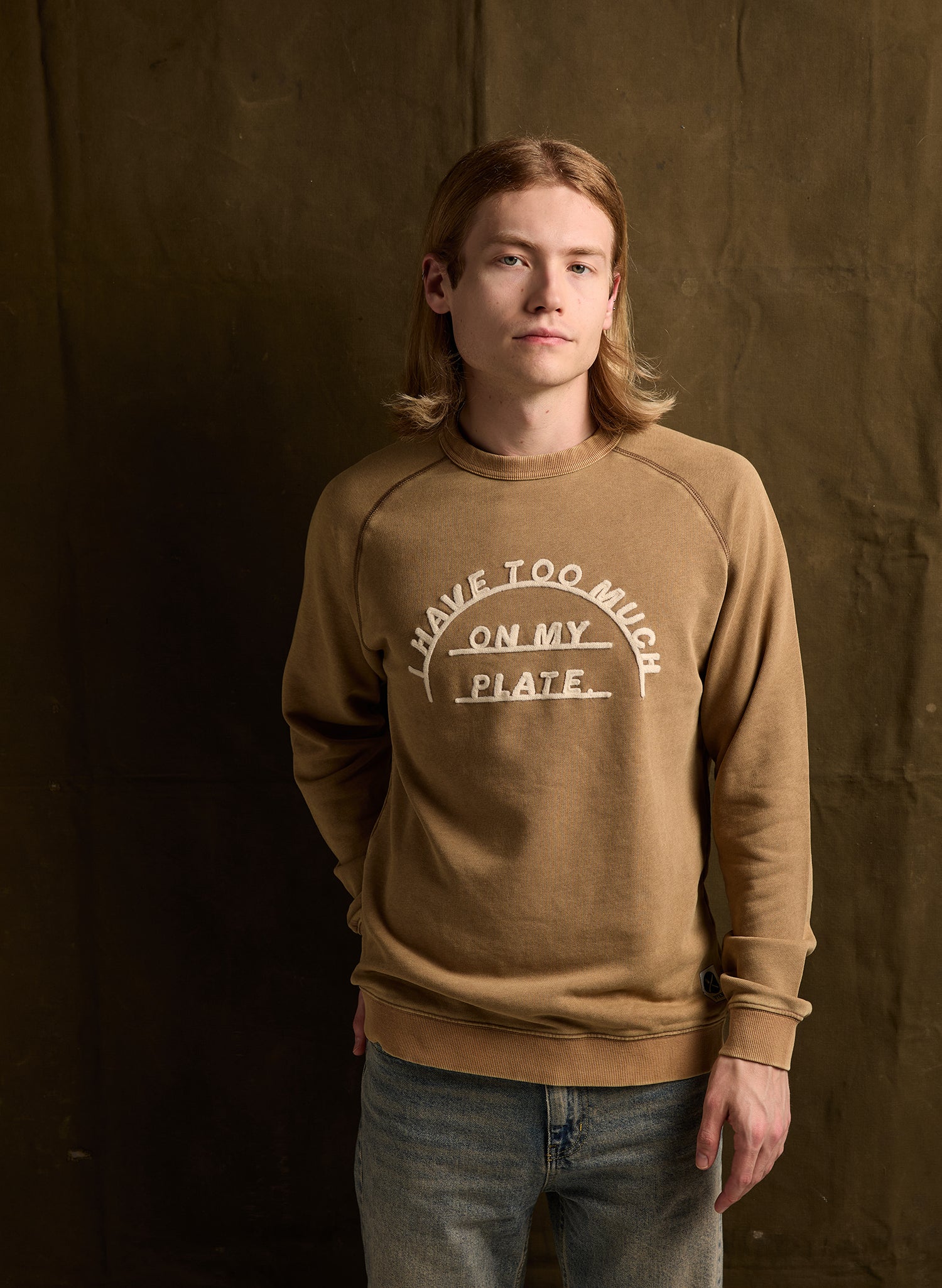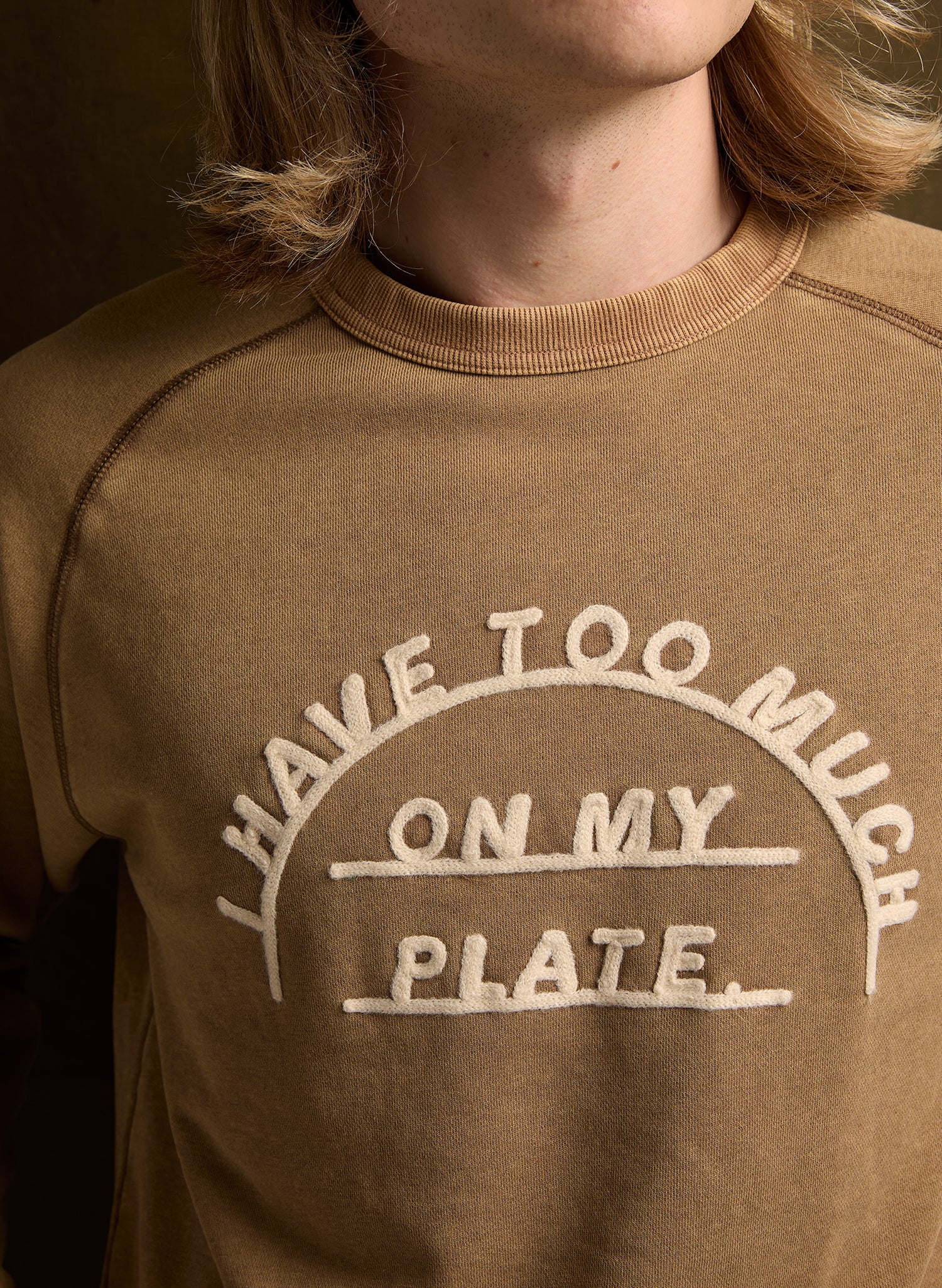 The 'I Have Too Much on My Plate' unisex adult raglan crewneck is made of high quality and comfy, vintage-washed 80% Cotton 20% Ramie blended fabric. The graphic sweatshirt design features chainstitch embroidery.