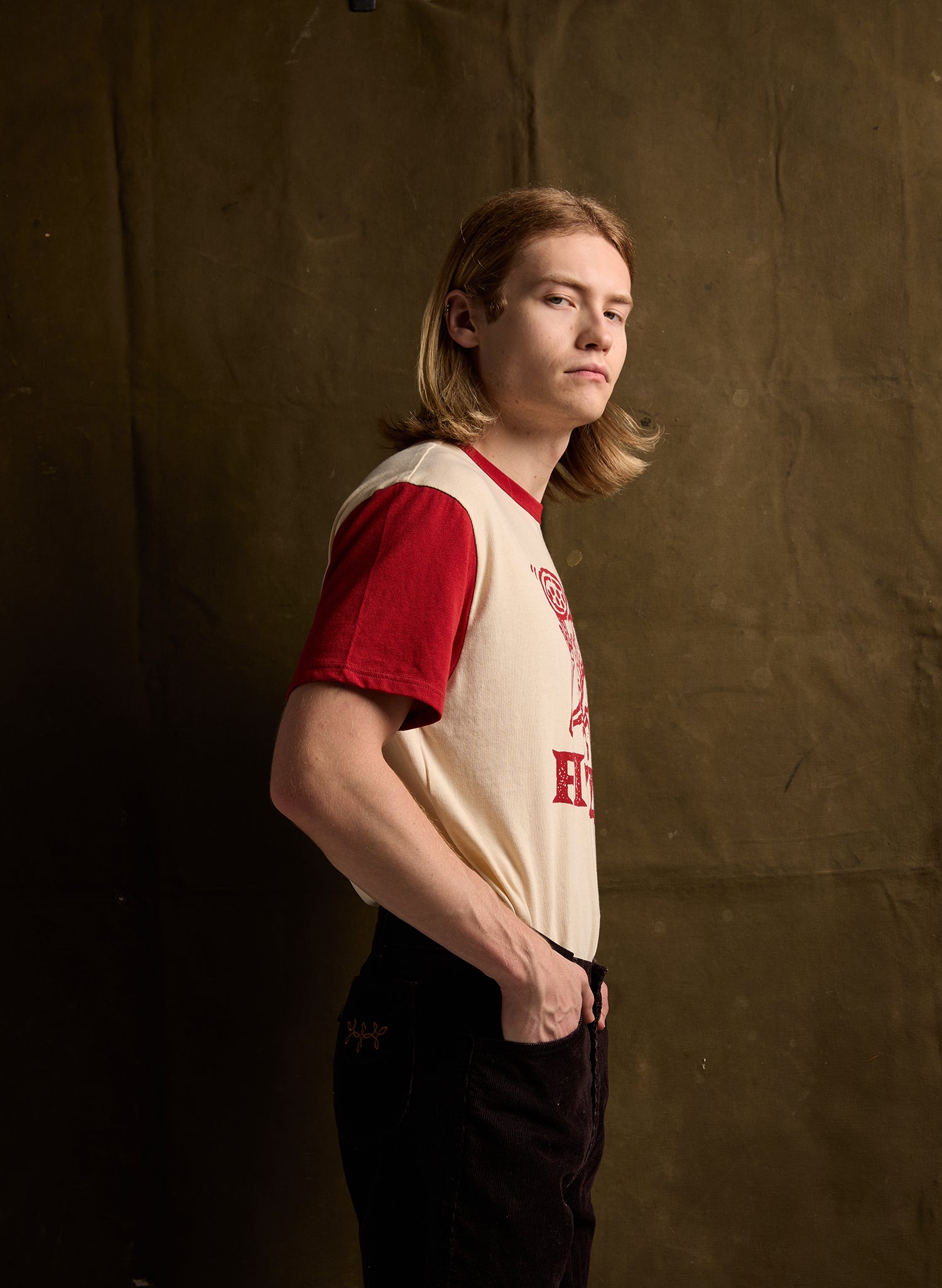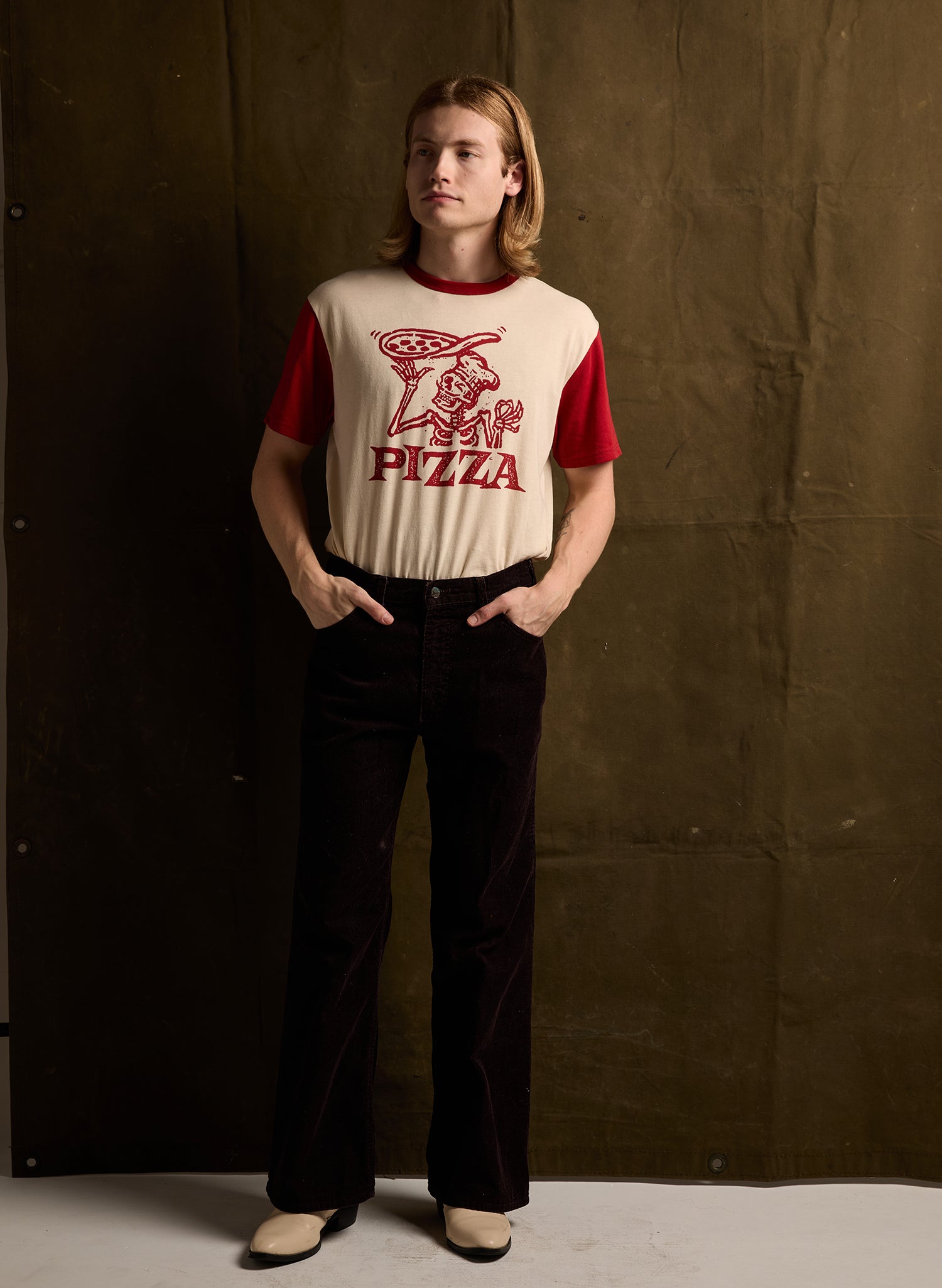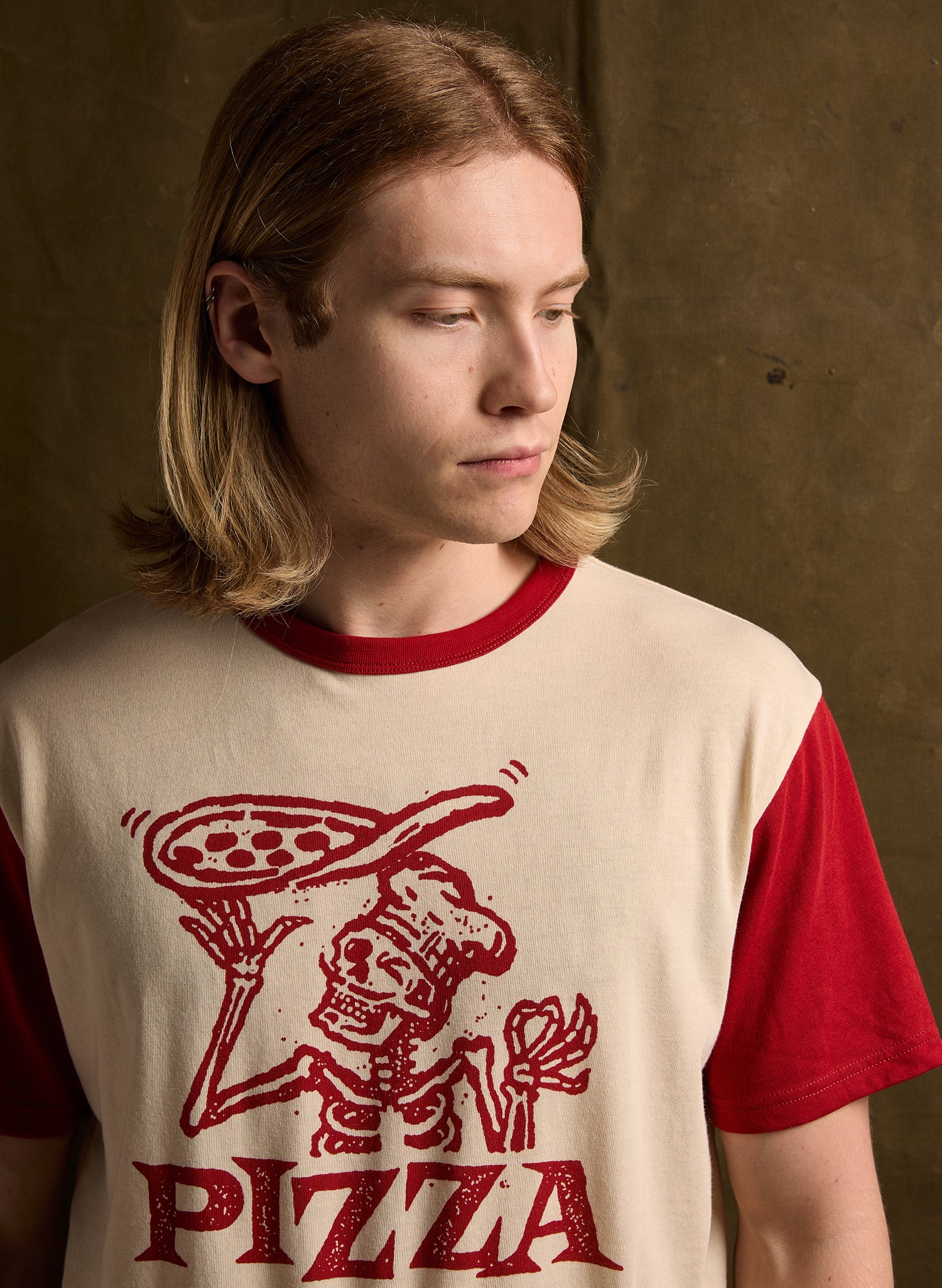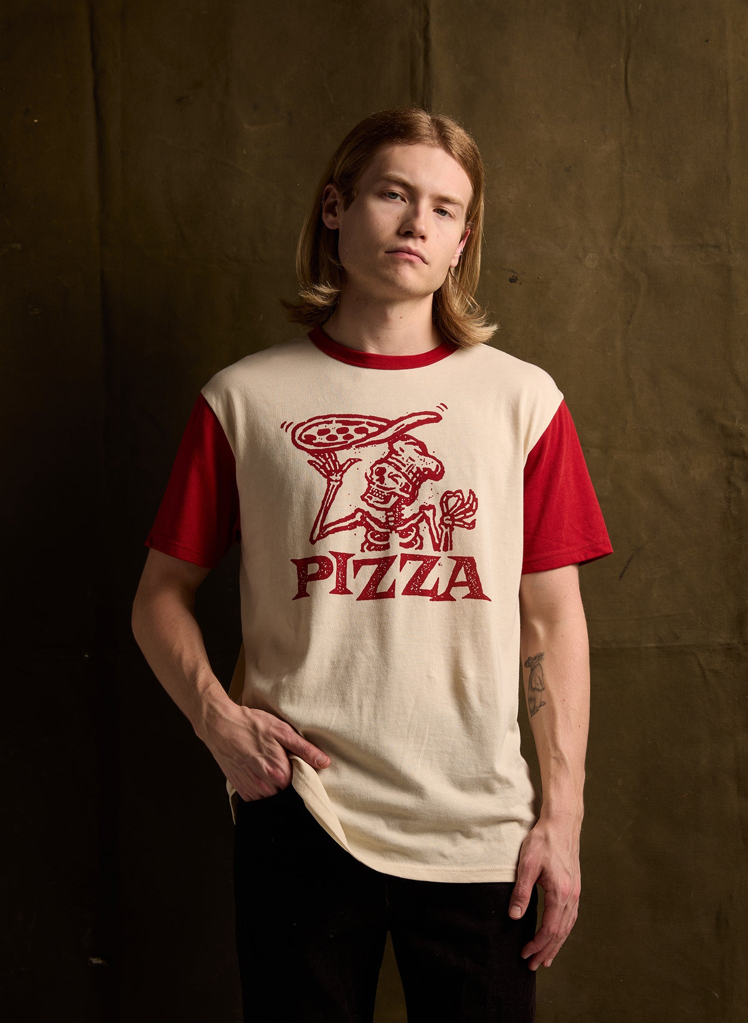 Say hello to the Pizza Tee, where retro pizza box vibes get a wicked twist with a snarky skeleton chef screenprint. Cut from a ridiculously soft 55% cotton, 45% rayon blend, this bad boy delivers comfort and vintage vibes. Rocking a Cream base with ‘Marinara Red’ collar and sleeves, it’s your go-to for looking effortlessly cool while showing your enthusiasm for pizza.