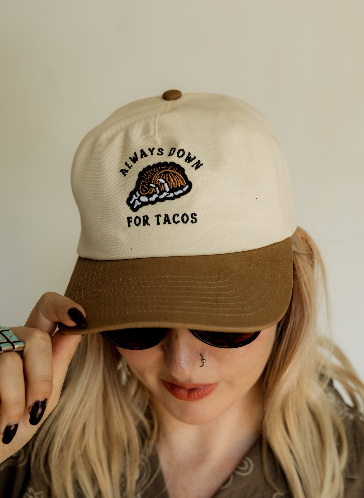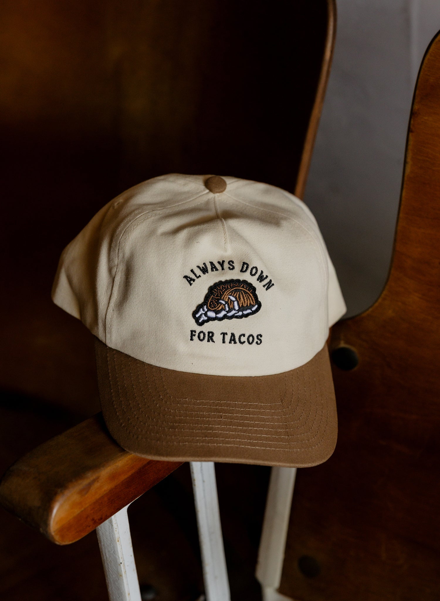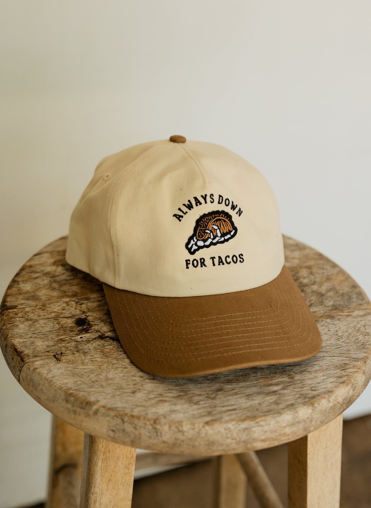 The unisex unstructured vintage style A Frame style cap features the "Always Down for Tacos" embroidery and a skeleton hand grasping a taco patch. The hat is made of a comfy brushed cotton twill and features an adjustable plastic snapback closure on the back.