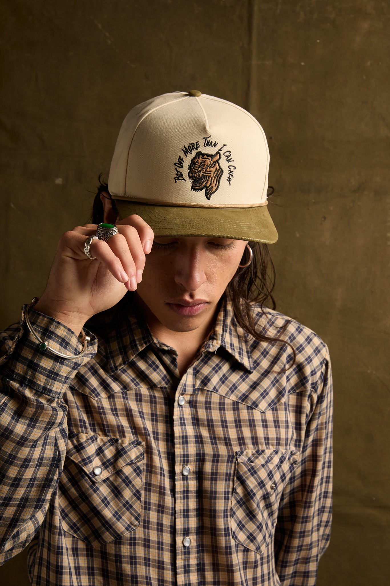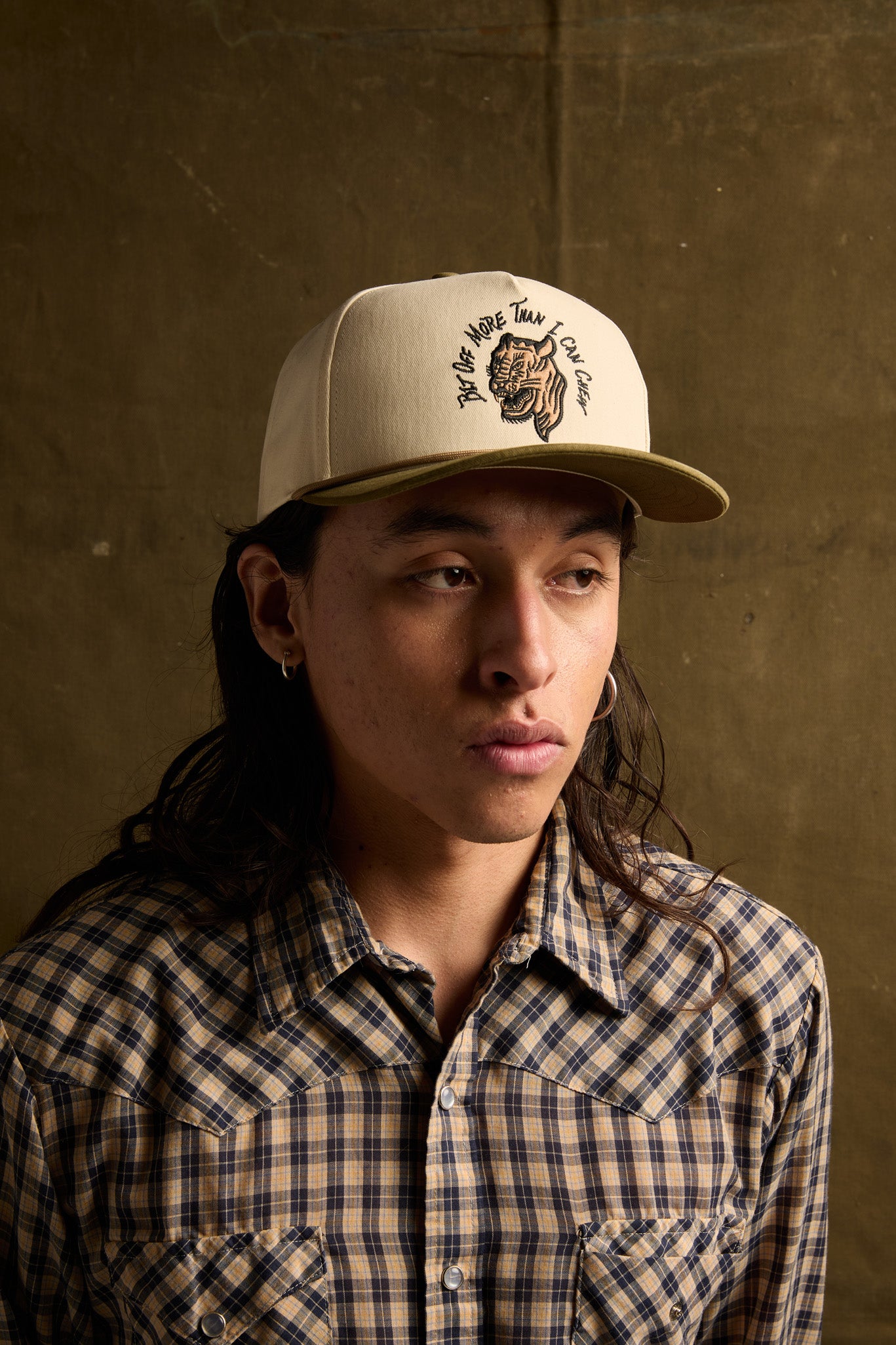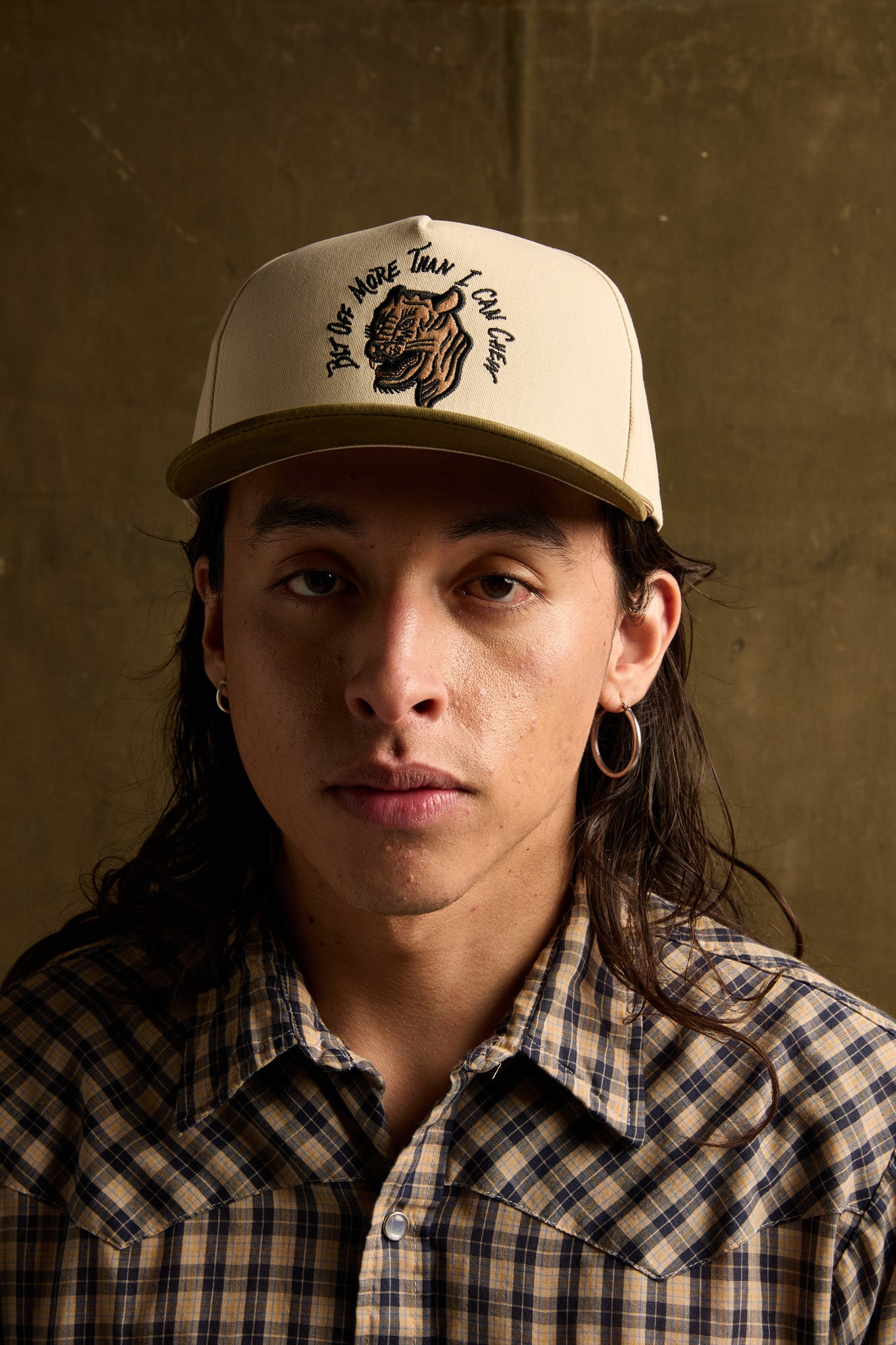 Front and center: an embroidered tattoo-style tiger, fierce and detailed, paired with the iconic phrase "Bit Off More Than I Can Chew" in bold lettering. It’s a badge of ambition, a wink at overcommitment, and an instant conversation starter.