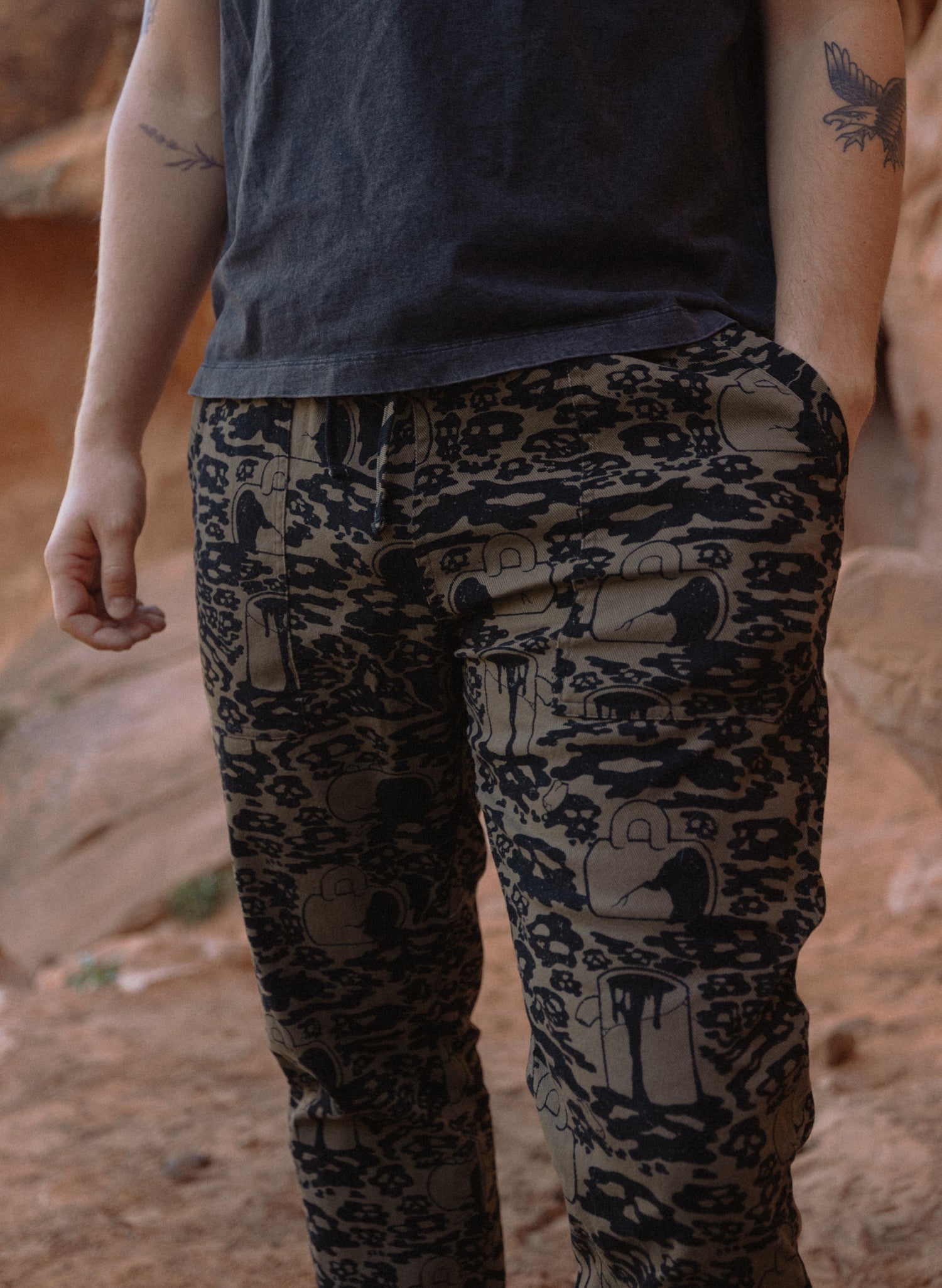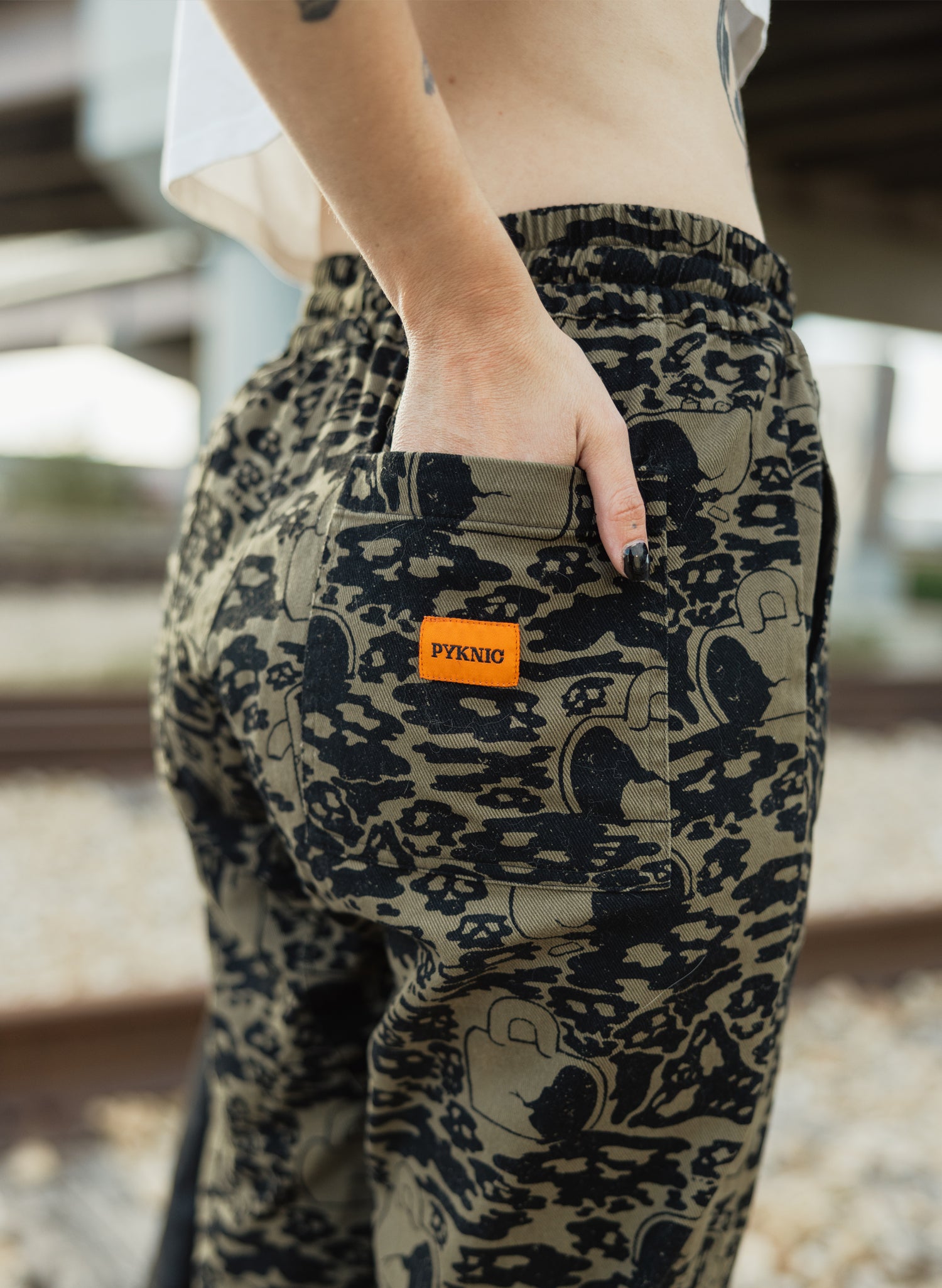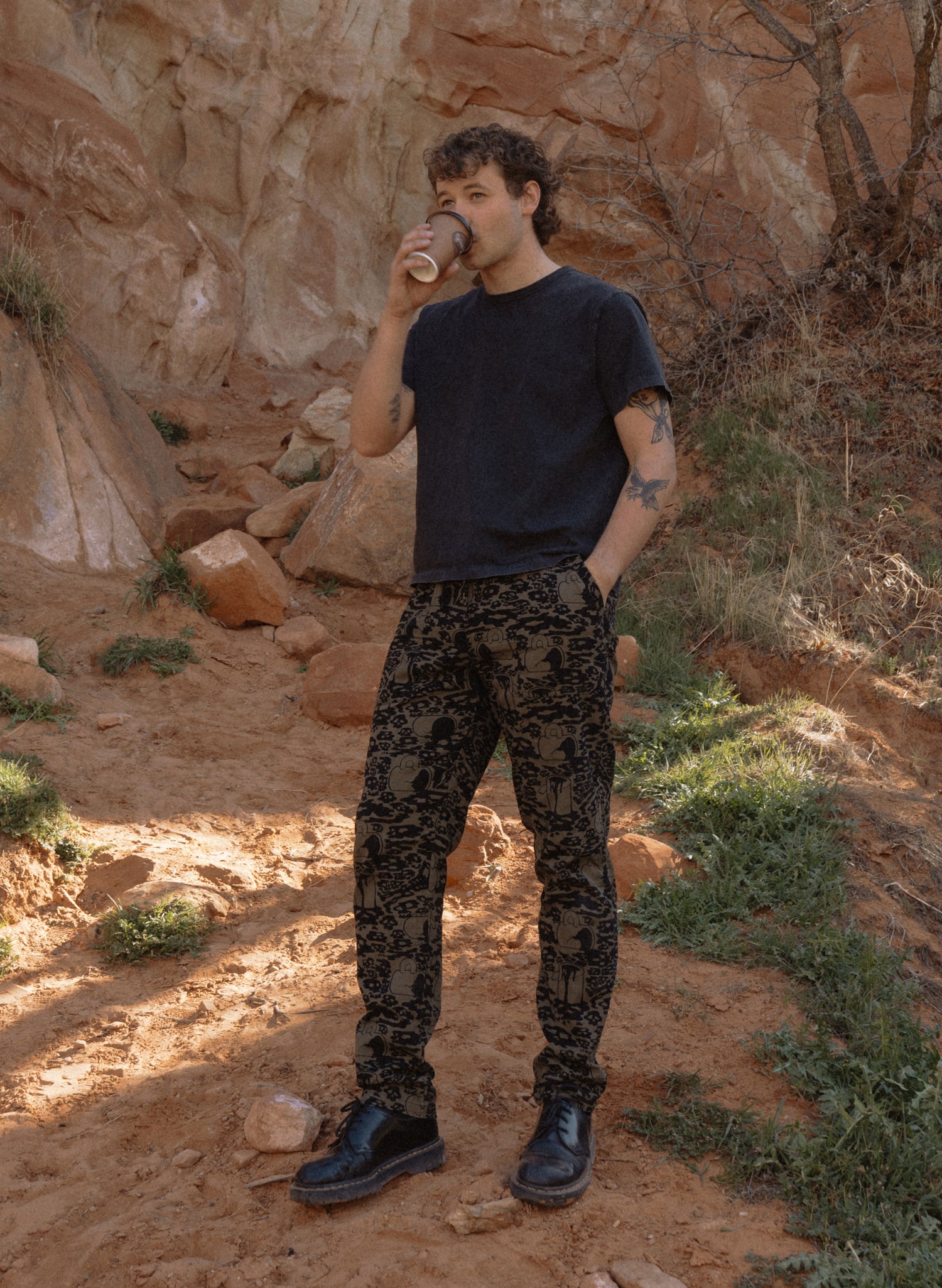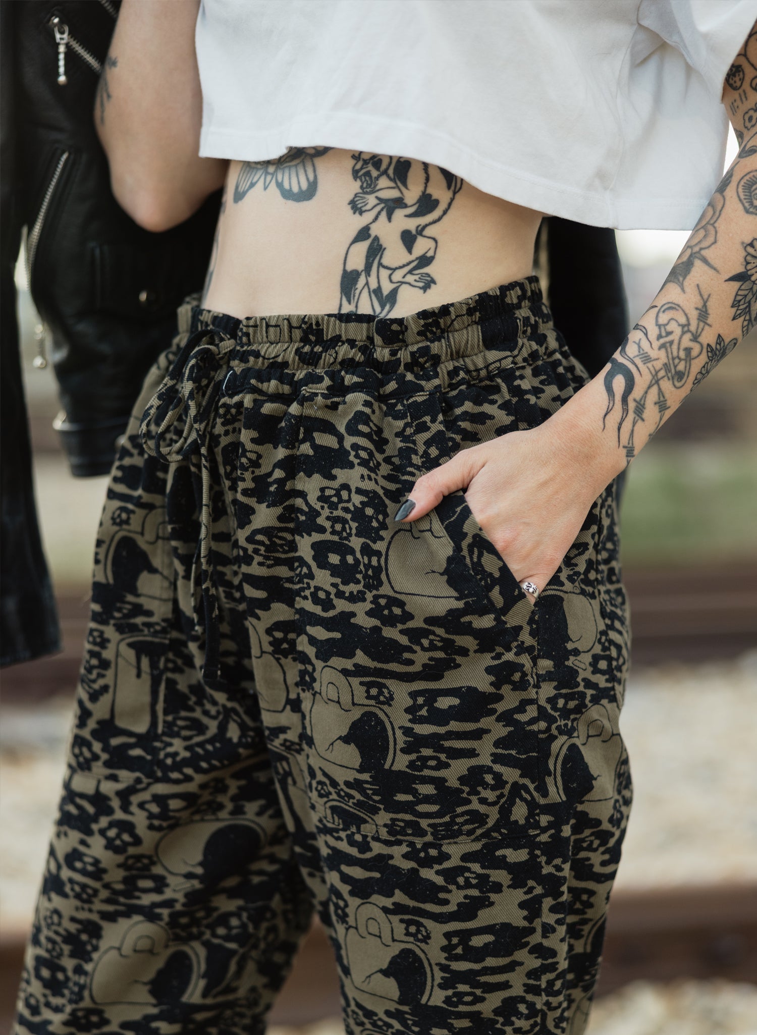 The Coffee Camo Pants blend rugged utility with a surrealist twist on your daily grind. Ditch the traditional woodland patterns for some "caffeine camo".