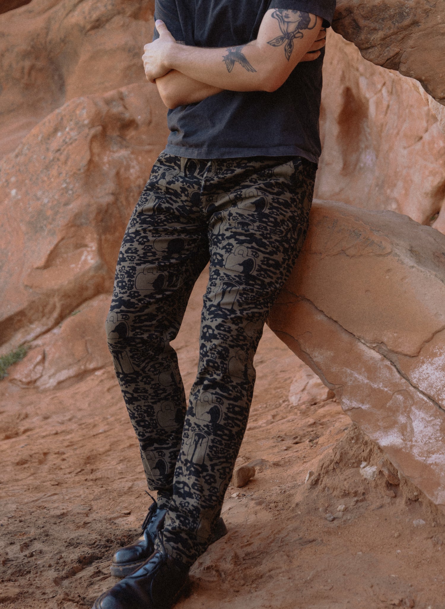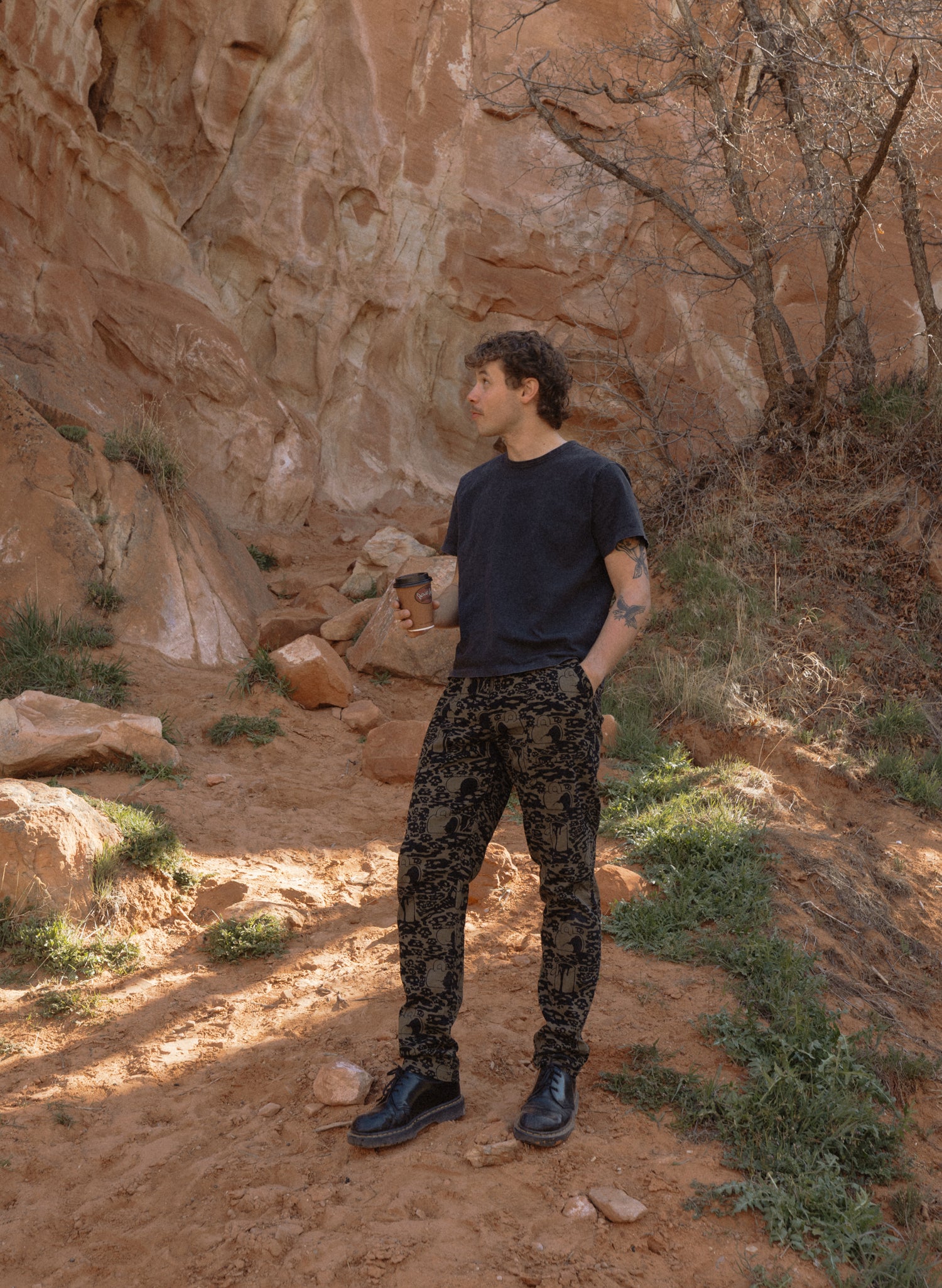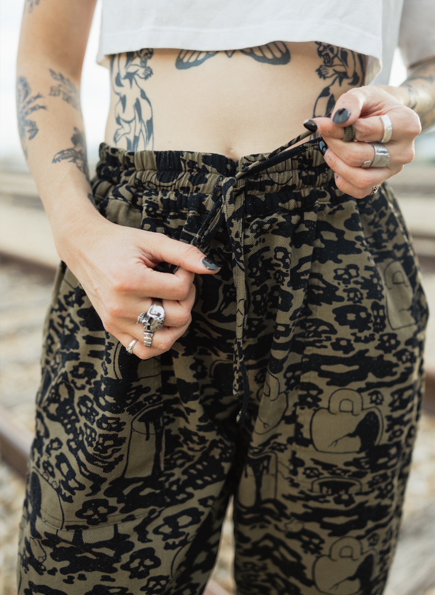 The Coffee Camo Pants blend rugged utility with a surrealist twist on your daily grind. Ditch the traditional woodland patterns for some "caffeine camo".